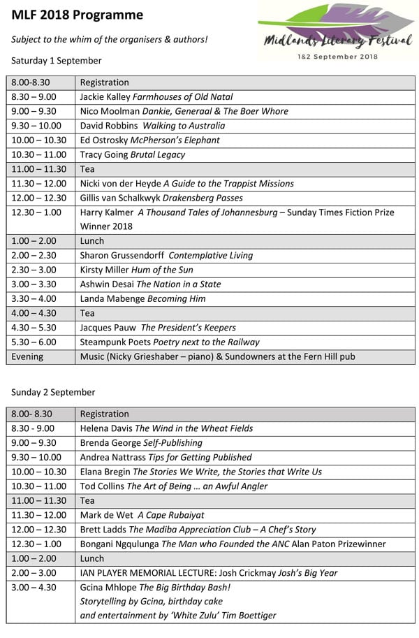 KZN's premier book festival, the Midlands Literary Festival, is taking place at Fern Hill Hotel near Howick on 1 & 2 September 2018. Here is the full programme.