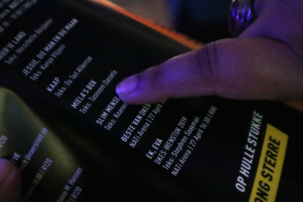 ’n Groot struikelblok was ommie play klaa te skryf. Ek het nie baie experience innie craft van playwriting nie. Ek het nie ’n dramagraad klaargemaak nie, en my journalist en creative writing training het my net soe ver gevat. Oorie jare het ek baie toneels byrie Baxter Theatre gekyk om self te leer oor drama skryf, en om drama in action te sien.