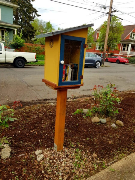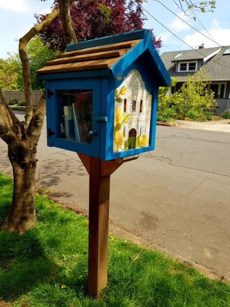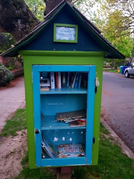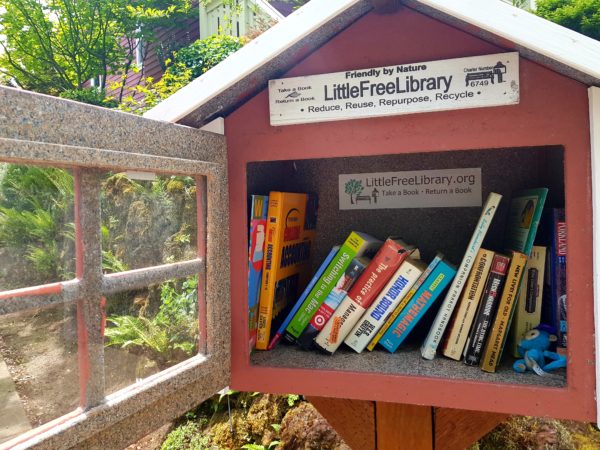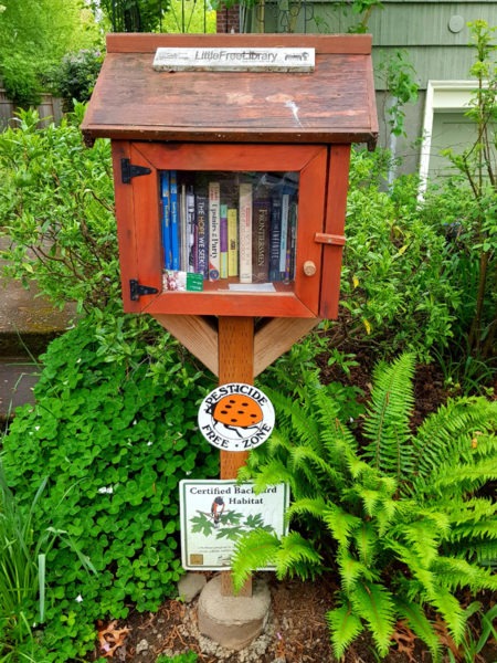 Buiten die bedagsame bestuurders wat stadiger ry of in die middel van die straat stop sodat voetgangers die pad kan oorsteek, was een van die eerste weird goed wat ons opmerk toe ons die woonbuurte te voet begin verken, klein houtkassies, staangemaak op pale van so ’n halwe meter lank, opgerig op sypaadjies en tuine. Van nader af het ons gesien dat dit vol boeke is! Eers het ons gedink dis iets wat net ’n paar huise doen, totdat ons hierdie minibibliotekies in verskeie woonbuurte regoor die stad gesien het. Die meeste het ’n interessante verskeidenheid boeke, maar in ander is daar selfs ornamente en kaartjies met motiveringsboodskappe op geskryf. Hiperbewus van COVID 19-protokol het ons soos ander voetgangers draaie om mekaar gestap en nie onnodig aan goed gevat nie. Dis eers onlangs dat ek voor die boekhuisies begin stilstaan het en uiteindelik, te danke aan ’n Little Free Library-naambordjie, agter die kap van die byl gekom het. Little Free Library is ’n niewinsgewende organisasie wat in Wisconsin gebaseer is. Mens kan óf jou eie minibibliotekie bou en met boeke inrig, óf jy kan een by hulle koop en teen ’n afslag boeke bestel of selfs verniet ontvang. Die idee is nie net om geletterdheid te bevorder en ’n liefde vir lees te kweek nie, maar om ’n gevoel van samehorigheid binne gemeenskappe te bevorder. Mens kan enige tyd ’n boek of twee uit so ’n bibliotekie neem, solank jy dit weer terugbesorg, of met ander boeke vervang. Ek het maar pas die vrymoedigheid gekry om die deurtjies oop te maak en vinnig na die boeke te kyk, maar een van die dae neem ek een uit sonder om bang te wees iemand gaan vanuit die huis op my skreeu wanneer ek daar doenig is! (Die inwoners, nie die kraaie nie.)