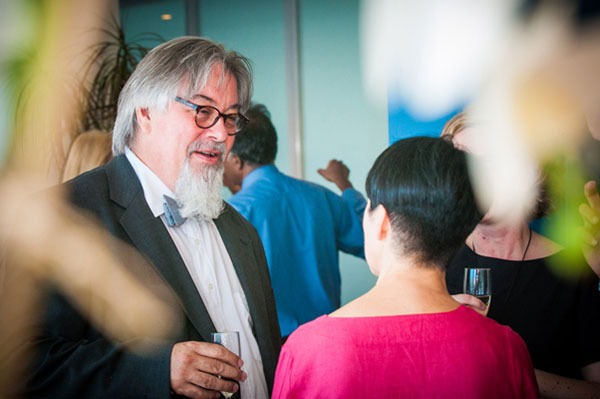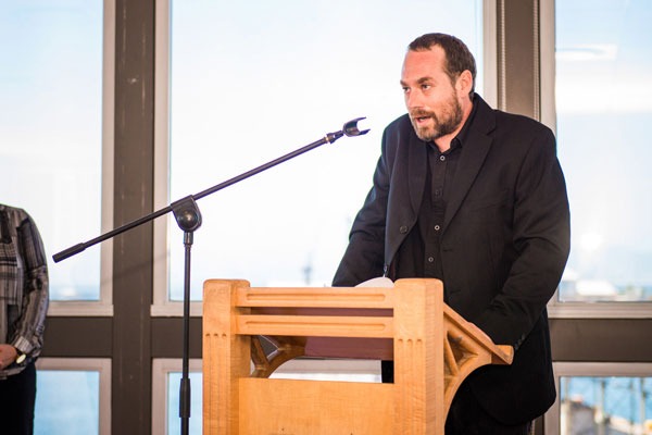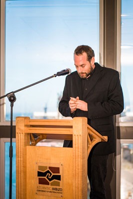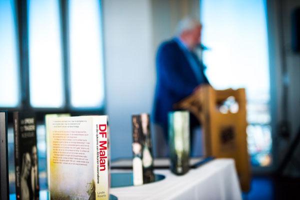 Herman Wasserman lewer die commendatio by die oorhandiging van die 2015 kykNET-Rapport Boekprys vir Niefiksie aan Stephanus Muller.