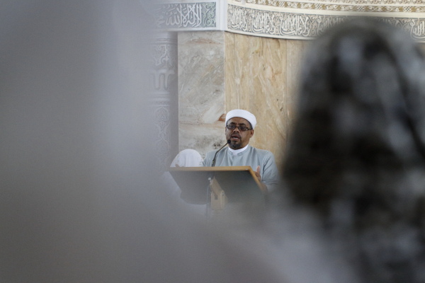 When I met with Sheikh Abduraghmaan Alexander (above) beforehand to ask about protocol, he chuckled: “There will a thousand women here today, don’t let that upset you.” Then he showed me the stairs so that I could walk up and down to shoot from different angles and perspectives. / Toe ek vooraf vir Sheikh Abduraghmaan Alexander (hierbo) vra oor protokol, lag hy: "Daar sal ’n duisend vroue teenwoordig wees vandag, moenie dat dit jou ontstel nie." Toe het hy my die trappe gewys sodat ek uit verskillende hoeke en perspektiewe kon afneem.