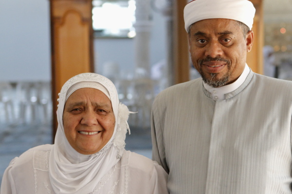 The one, auntie Koelsoem Kamalie (seen here with Sheik Alexander), is a devout Muslim, and a member of the Vangate Mosque. She arranged the invite for me. / Die een, tannie Koelsoem Kamalie (hier saam met Sheik Alexander), is 'n toegewyde Moslem en 'n lid van die Vangate Moskee. Sy het die uitnodiging vir my gereël.