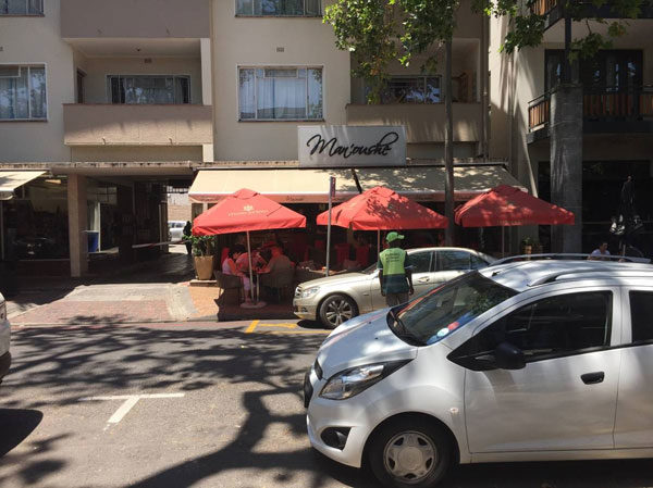 Man’oushe is a Lebanese restaurant at 14 Andringa Street. Tables overflow from the restaurant onto the sidewalk, and it’s popular with students. The telephone number is 021 886 7545. It opens each day from 8:00 am to 9:30pm, except Sundays (12:00 noon – 9:30 pm). See items from the menu here.