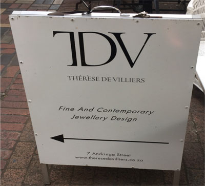 Shop times are Monday to Friday 10:00 am – 5:00 pm, Saturday 10:00 am – 2:00 pm, closed Sundays. The address is 7 Andringa Street, the telephone number is 021 883 3819 and appointments can be made at therese@theresedevilliers.co.za. For examples of designs and products from Thérèse de Villiers, visit the website.