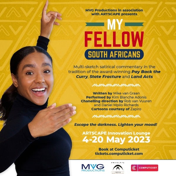 My fellow South Africans is ’n satiriese blik op kontemporêre Suid-Afrika uit die pen van die gevierde dramaturg Mike van Graan (Pay back the curry, Green man Ffashing, When swallows cry). Dié multiskets-vertoning met die veelsydige en briljante Kim Blanché Adonis solo op die verhoog het op 4 Mei in die Kunstekaap in Kaapstad geopen en ná die huidige speelvak tot 20 Mei sal dit hopelik wyd aangebied word tot volgende jaar se maak-of-breek-verkiesing.