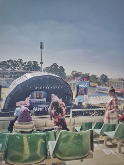 Ons haal ’n Uber vroegerig die oggend. Ek wil nie met die ander 15 000 mense meeding vir ’n plastiekstoeltjie in die son nie. Met ’n buitensporig duur rooibosteetjie in die hand bestudeer ek die skare om my.