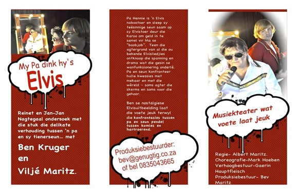 “Die stuk handel oor soveel meer as ’n man wat die platteland met sy Elvis-nabootsing platry. In my lewe het daar al ’n hele paar aspirant-Elvisse op die verhoog my professionele pad gekruis, maar Ben Kruger s’n ruil ek vir nie één van hulle nie. Dis juis omdat Ben die broosheid van sy karakter – vokaal, maar veral ook as mens met ’n verlede wat in sekere opsigte onherroeplik tragies is – met ’n oortuigende innerlike dimensie aanvat. Voorts is dit ook ’n stuk oor een van die mees verwikkelde tipe verhoudings wat bestaan: dié tussen pa en seun."