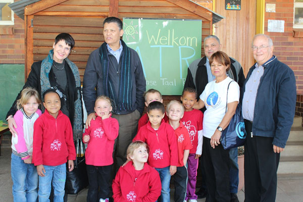 Magdie de Kock, Michael le Cordeur, Waldy Kastoor, Ria Olivier en Jacques van der Elst is hier by die kinders van 'n kleuterskool wat die ATR verwelkom.
