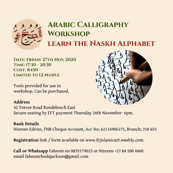 Ek leer nou introductory calligraphy workshops en courses vanaf 2017 want ek wou Dr Sulaiman en sy calligraphy circle van 30 jare se groundwork continue. Om meer te leer oo my en wat ek doen, djy kan vi my op social media follow.