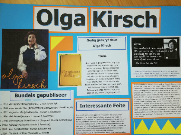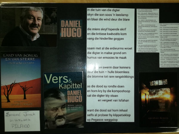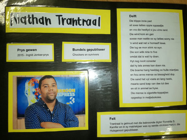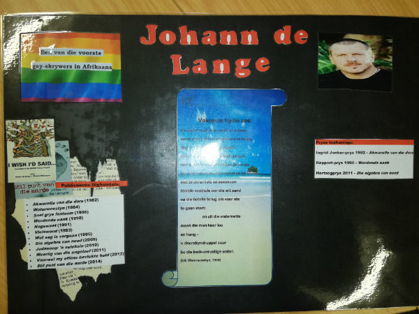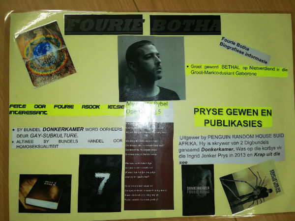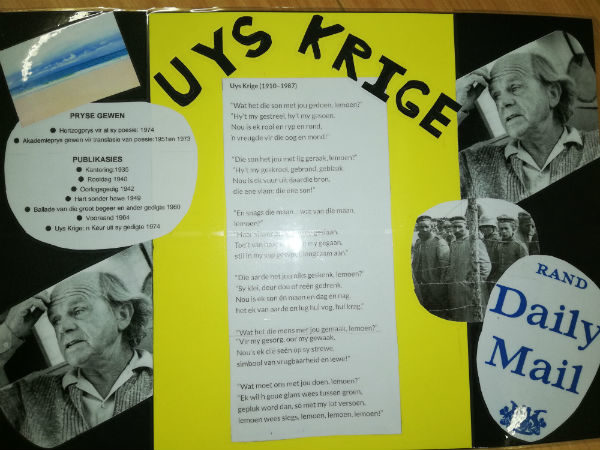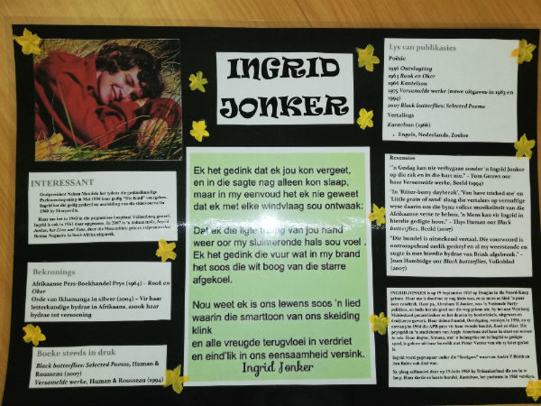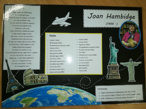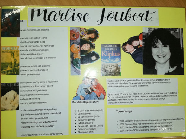 Ter voorbereiding vir die Afrikaanse poësiemodule wat die eerstejaarsklas (Intermediêre Fase) in die tweede semester aan die Nelson Mandela-Universiteit se opvoedkundefakulteit gaan volg, is studente aangemoedig om vooraf oor Afrikaanse digters te gaan oplees. Elke student het die naam van ’n digter ontvang en moes ’n visuele uitbeelding van die digter se lewe en werk saamstel. Die studente het die opdrag terdeë geniet en met allerlei kreatiewe skeppings vorendag gekom. Die gedigte wat studente gekies het, was insiggewend. Sommige studente het die uitbeelding van motiewe en temas in digters se werk beklemtoon, soos in die geval van die reismotief by Joan Hambidge en Bibi Slippers se liefde vir skape. Graag deel ek ’n paar van die studente se plakkate met LitNet se lesers.