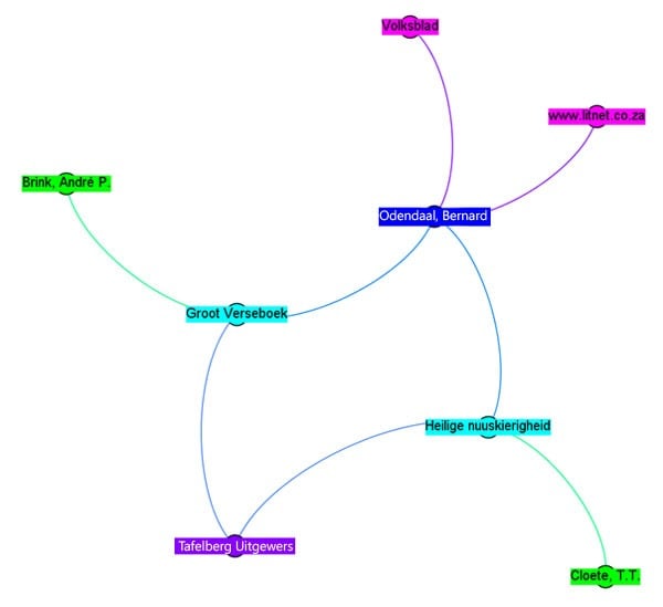Hier kan gesien word dat Brink die samesteller van Groot Verseboek was en Cloete die outeur van Heilige nuuskierigheid. Beide werke is deur Tafelberg uitgegee, en beide is deur Bernard Odendaal geresenseer. Een resensie het by LitNet verskyn en die ander in Volksblad. Indien die netwerk só saamgestel is, kan daar geen driehoeke bestaan nie, aangesien die publikasieplatforms (in pienk aangedui) nie by mekaar kan publiseer nie, net soos literêre werke (in seegroen aangedui) ook nie oor mekaar kan skryf nie.4 Om hierdie rede is die netwerk vereenvoudig na mense, waar daar ’n direkte skakel tussen Odendaal en Cloete sowel as tussen Odendaal en Brink aangedui word.