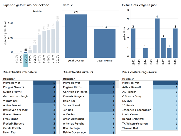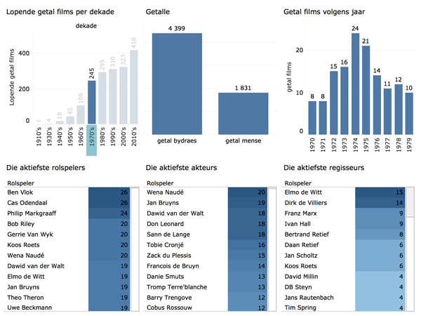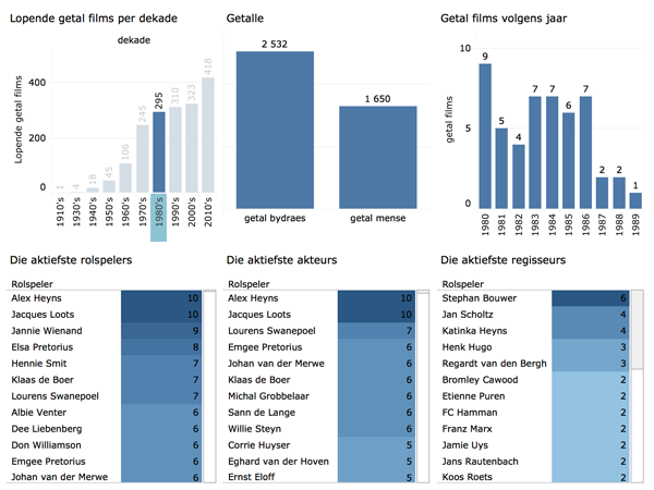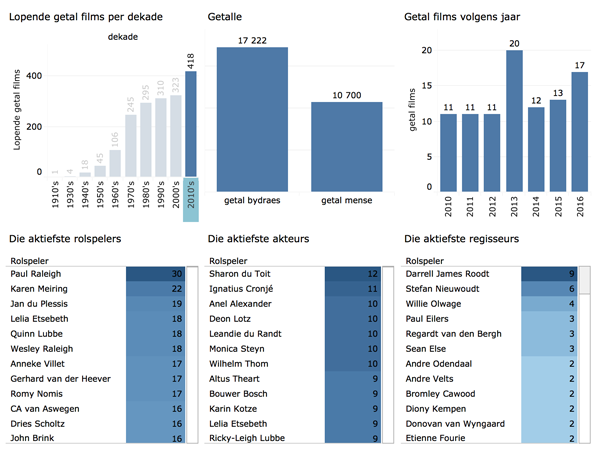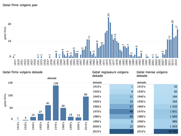 Figuur 1 verskaf ’n opsomming van die Afrikaanse filmbedryf (1916–2016). Hier word die getal films volgens jaar en volgens dekade aangedui, asook as die getal mense betrokke by die Afrikaanse filmbedryf (volgens die krediete van die films) en die getal regisseurs wat betrokke was. Let daarop dat daar wel meer films in die 1970's as in die 2010's vrygestel is, maar dat daar tans meer regisseurs betrokke is.