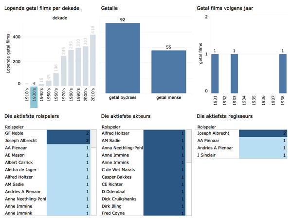 Figuur 2 verskaf ’n opsomming van wanneer films in hierdie dekade verskyn het, hoeveel films daar teen die einde van die dekade reeds in Afrikaans was (die "lopende getal" films per dekade), die getal bydraes wat op die krediete van hierdie films aangedui is en die getal mense wat by hierdie films betrokke was. Die figuur dui ook aan wie die produktiefste akteurs, regisseurs en rolprentfigure oor die algemeen was. Komende dekades word op dieselfde wyse opgesom.