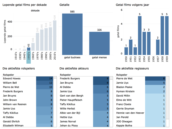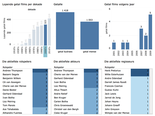 Figuur 11 verskaf ’n oorsig oor die geheel. In die eeu lange geskiedenis van die Afrikaanse filmbedryf was 16 166 rolprentfigure betrokke by Afrikaanse films (volgens die krediete van daardie films), met altesaam 29 959 bydraes. Die produktiefste regisseur was Elmo de Witt, gevolg deur Dirk de Villiers, Jamie Uys en Pierre de Wet. Jan Scholtz het die meeste draaiboeke geskryf, gevolg deur Jamie Uys en Emil Nofal. Sann de Lange het rolle in die meeste Afrikaanse films vertolk, met Wena Naudé en Jan Bruyns kort op haar hakke. Oor die algemeen is die rolprentfigure – akteurs of andersins – wat die meeste bydraes tot Afrikaanse films gelewer het (volgens die films se krediete) Sann de Lange, Wena Naudé en William Bell.