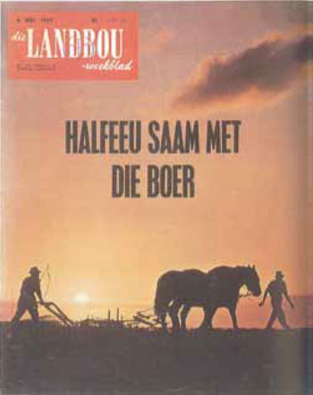 As it is impossible to reproduce every aspect of history, media historians merely try to collect, merge and interpret “fragments” (Scannell 2002:201). With this reality of merely being able to present “fragments”, it is important to sketch briefly the political-economic situation of the target market that Landbouweekblad served. White Afrikaners were politically, economically, financially and culturally on their knees after the South African War, which increased the impetus for Afrikaner Nationalism. The post-war situation, also that of the World War I, led to the fact that by 1936, 50% of one million Afrikaners were urbanised (Morris 2012:20). Few of these first-generation urban Afrikaners, also called “poor whites”, could compete for jobs in an urban economy, because they had neither the training nor the experience for city professions. According to Giliomee (2012:300) a study showed that 44 Afrikaners from a class of 100 school beginners in 1933 would leave school without having completed standard 6 (grade 8 in today’s terms). Only eight would pass matric, and fewer than three would go to university. Afrikaners’ per capita income was half of that of English speakers. Only a few “Afrikaner” companies were established at that time (Morris 2012:20). They were Naspers (today Media24, as a subsidiary of Naspers, the owner of Landbouweekblad), Santam, Sanlam and Volkskas. By the end of the 1930s, the Afrikaner share in mining was 1%, 3% in manufacturing, 5% in the financial sector and 8% in trade and industry. According to Morris, only 3% of professional positions were filled by Afrikaners in 1939. During all these decades, as a social barometer Landbouweekblad recorded changes in technology, politics and modernisation. For instance, it called the post-World War II technological changes in agricultural mechanisation a “revolution”. This is but one example of how the magazine developed over its ten decades, measuring the ecology within which it existed.
