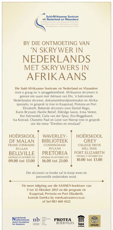 Die sprekers by die Kaapse funksie is: Karin Brynard, Hanlie Retief, Ilza Roggeband, Chanette Paul en Adriaan van Dis wat met Daniel Hugo in gesprek sal wees. Isa Konrad sal ook, via Skype, vanuit Switserland meedoen. Die koste is R90. ’n Ligte middagete en ander verrassings is by die kaartjieprys ingesluit. Bespreek by gvisser@dfmalan.com.