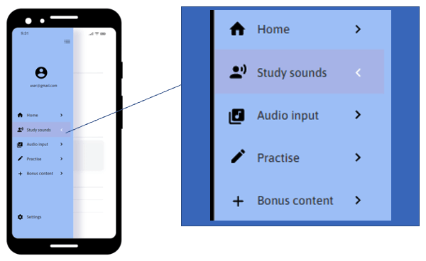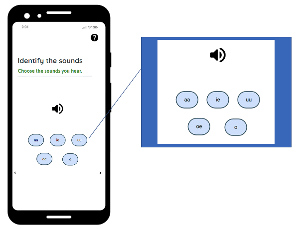 Daarna volg die bespreking en toepassing van speletjieselemente, en die leerervaring word gestruktureer deur die klanke te gebruik wat gebruikers moet leer. Die gebruikers het toegang tot direkte onderrig van die klanke, speletjies om die leermateriaal te oefen en vas te lê en ook toetse om hulle kennis te toets.