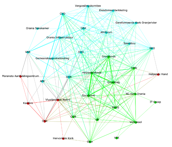 On a micro-level it is shown that, unlike most studies of company director networks, the bank does not occupy a central position in Orania’s institutional network, but rather the Orania Representative Council (OVR) and institutions that are concerned with social development. The picture one gets from a micro-level analysis is that institutions that are involved in financial aspects hold central positions only if they are also socially oriented (for example, the Groeifonds and the Helpsaamfonds); otherwise financial institutions such as the Chamber of Commerce and bank occupy peripheral positions.