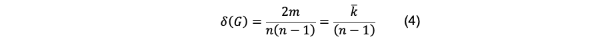 Digtheid (δ) is eerste deur Bott (1957) bestudeer en meet die getal skakels (m) tussen nodusse (n) in die netwerk teenoor die getal moontlike skakels (Guillaume en Latapy 2006:796; Haythornthwaite 1996:332). Die digtheid van die netwerk (δ) word met behulp van Vergelyking (4) bereken (Humphries en Gurney 2008) (k dui op die gemiddelde aantal skakels in die netwerk):