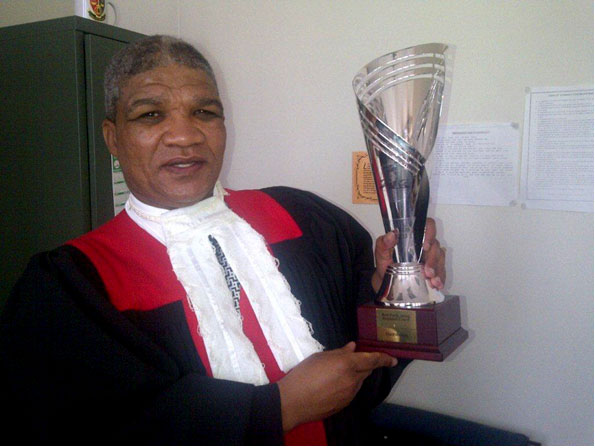 Foto 2. Dennis Boks, voorsittende beampte van die hof met die hoogste vervolgingsyfer vir seksuele misdrywe in die Wes-Kaap, met die trofee wat vir hierdie prestasie verwerf is.