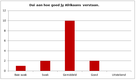 • Die vreemdetaalstudente het wisselende grade van Afrikaans-taalvaardigheid. As gevolg van die gebrek aan ’n gestandaardiseerde toets om Afrikaanse taalvaardighede op grond van die Europese Referensiekader (2001) te meet, is dit moeilik om die verbetering van woordeskat van die studente werklik te bepaal.