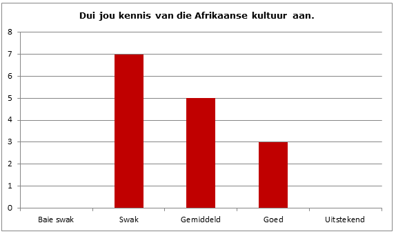 Na aanleiding van die resultate van die vraelyste kom ons tot die volgende gevolgtrekkings: Die studente het wisselende grade van Afrikaanse taalvaardigheid, maar hulle wil graag hulle Afrikaanse woordeskat verbeter. Hulle is van mening dat ’n kultuurkomponent hulle daarmee kan help. Op grond van verskeie taakgebaseerde kultuurgeoriënteerde lesse het die studente aangedui dat hulle dit geniet het om meer van die Afrikaanse kultuur te leer én dat dit hulle gehelp het om hulle woordeskat te verbeter.