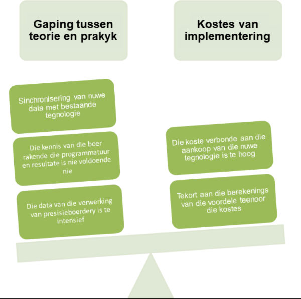 Uit die bostaande is dit duidelik dat presisieboerdery ’n deurslaggewende rol in landbou kan speel; die vraag ontstaan dan waarom baie van die landbouprodusente nie hierdie tegnologie gebruik nie, en wat die hindernisse is wat hulle beperk om presisieboerdery te implementeer.