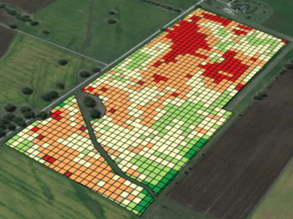 Landboubeheersentrums integreer die sensordata en beeldinvoerinsette met ander data en verskaf sodoende inligting wat landbouprodusente die vermoë gee om lande te identifiseer wat behandeling benodig. Sodoende word die optimale hoeveelheid water, kunsmis en plaagdoders bepaal en geïllustreer soos in Figuur 4 aangedui.