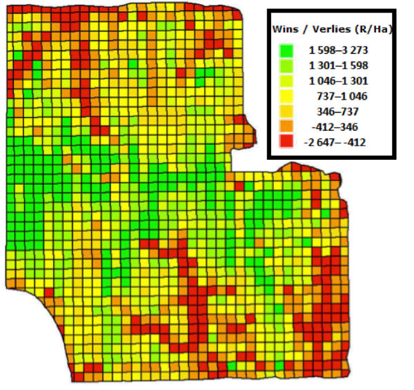 Die versamelde inligting stel die boer in staat om insetkostes optimaal te bestuur deur die vermorsing van hulpbronne, soos die afloop van besproeiingswater of oorbodige toedienings van bemestingstowwe, te voorkom. Optimale grondbestuur minimaliseer ook die plaas se omgewingsimpak (Rouse en Wingmore 2016:1). Die GPS en GPS-tegnologie stel die boer verder in staat om die spesifieke kostes van elke gedeelte van die land te vergelyk met die opbrengste van daardie spesifieke gedeelte, en gevolglik kan die boer presies bereken hoe winsgewend elke gedeelte van die land is. Figuur 5 hier onder toon aan hoe die winsgewendheid van ’n land aangedui word. Hierdie data word gebruik in die beplanning vir die volgende seisoen.