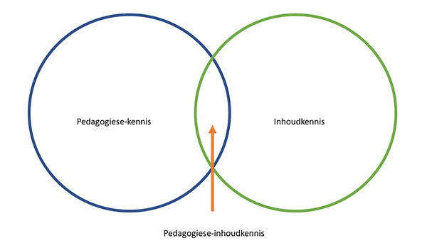 Daar is aanvanklik geredeneer dat ’n onderwyser oor uitgebreide inhoudkennis moet beskik om suksesvol in die klaskamer te kan wees, maar pedagogiese-kennis is later by die kurrikulum gevoeg omdat onderwysers ook moet weet hoe om die vakinhoud aan te bied (Shulman 1986). Shulman (1986) was van die eerste skrywers wat geredeneer het dat hierdie twee kennisbasisse nie afsonderlik kan funksioneer nie omdat onderwysers uit beide moet put om onderrigstrategieë te ontwikkel wat die aanleer van moeilike vakinhoud te kan fasiliteer. Om dié idee oor te dra, het Shulman (1986) die term “pedagogical content knowledge”, wat ek vrylik as pedagogiese-inhoudkennis vertaal, geskep om te verwys na die snypunt (Figuur 1) waar pedagogiese en inhoudkennis mekaar ontmoet.