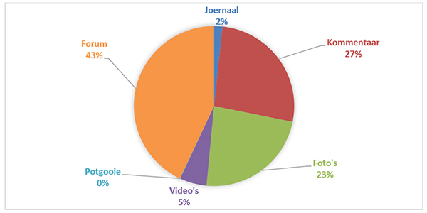 Die hoofkieslys bied drie skakels waarop geklik kan word om toegang tot gedeelde oudiovisuele media te verkry, naamlik Foto’s, Video’s en Musiek (Figuur 7). Die gedeelde oudiovisuele media kan ook onder albums georganiseer word. Aan die onderkant van die foto-tuisskerm is hiperskakels na albums, foto’s, ’n onderwyser se eie foto’s en sy of haar eie albums. Onderwysers kan van gedeelde foto’s hou, kommentaar daarop lewer en dit op hulle eie profielmure of dié van vriende deel. Aan die onderkant van die video-tuisskerm is skakels na alle video’s, ’n onderwyser se eie video’s en ’n onderwyser se vriende se video’s. Onderwysers kan van die video’s hou en daarop kommentaar lewer. Anders as in die geval van die webwerf, moet onderwysers deur al die video’s blaai om ’n spesifieke video te vind. Die webwerf stel soortgelyke video’s voor sodra ’n onderwyser op ’n video klik om daarna te kyk. Die musiekfunksie word gebruik om potgooie te deel. Onderwysers kan, net soos in die geval van die ander funksies, van die potgooie hou of kommentaar daarop lewer.
