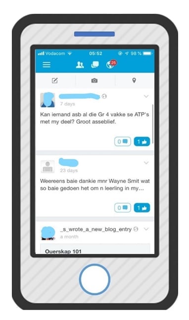 Die gemeenskaplike muur word op die res van die tuisskerm vertoon. Net soos in die geval van ander sosialenetwerkdienste verskyn die mees onlangse interaksies aan die bokant van die skerm, gevolg deur die res van die interaksies, wat in chronologiese volgorde gerangskik is. So verkry onderwysers toegang tot gesprekke wat reeds plaasgevind het. Aan die onderkant van elke besprekingspunt is twee ikone waarop geklik kan word om aan die gesprekke deel te neem, naamlik ’n “hou van”-ikoon en ’n kommentaar-ikoon (Figuur 5).