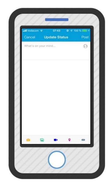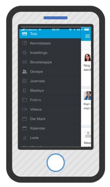 Aan die bokant van die tuisskerm is twee kieslyste onder mekaar geplaas (Figuur 4). Die blou kieslys bied, van links na regs, toegang tot die hoofkieslys (ook bekend as ’n hamburger-kieslys), vriendskapversoeke, boodskappe en kennisgewings (Figuur 4). ’n Getal aan die bokant van laasgenoemde drie ikone dui daarop dat nuwe vriendskapversoeke, boodskappe of kennisgewings ontvang is. Toegang tot die hoofkieslys word ook verkry as ’n gebruiker op die skerm druk en na regs blaai.