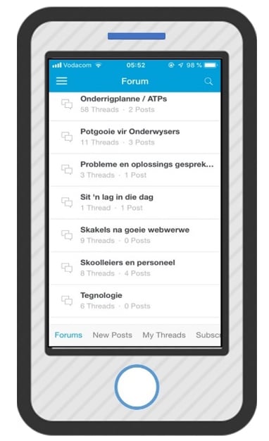 ’n Gedeelte van die tuisskerm is op die skerm sigbaar om onderwysers daaraan te herinner dat hulle links kan blaai om na die tuisskerm teruggeneem te word. Hierdie kieslys bied skakels na verskeie ander skerms van die Arend-toep (Figuur 7). Enkeles wat gebruik kan word om inhoud te skep, word vervolgens bespreek. Die inhoud van die forum (Figuur 7) is onder ’n aantal temas (met subtemas tussen hakies aangedui) ingedeel, naamlik Arend (2), bronne vir onderwysers (11), Afrikaans (12), Laer- en kleuterskool (1), ander skoolvakke (25), kursusse (3), sport en kultuur (2) en algemene besprekings. Die doel daarvan is om onderwysers vinniger na die regte inhoud of plek vir besprekingspunte te lei (Figuur 8) om toegang tot die regte inhoud moontlik te maak.