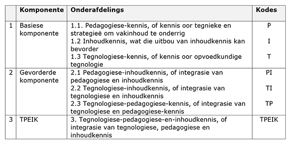 Die drie gevorderde komponente staan as pedagogiese-inhoudkennis, tegnologiese-inhoudkennis en tegnologiese-pedagogiese-kennis bekend.