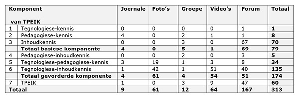 5 Ek verkies om afkortings so min as moontlik te gebruik. In die tabel verwys die afkortings na die komponente as volg: T – Tegnologiese-kennis, P – Pedagogiese-kennis, I – Inhoudkennis, TI – Tegnologiese-inhoudkennis, TP – Tegnologiese-pedagogiese-kennis, PI– pedagogiese-vakinhoudkennis