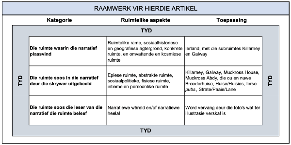 Op grond van die teorieë van literêre ruimte soos deur Ryan (2014) en Kort (2004) beskryf, is ruimtelike en tydruimtelike aspekte in drie kategorieë ingedeel om die raamwerk hierbo te skep waarvolgens die tekste van die twee Ierse dagboeke van Schoeman en die boek van Winters ontleed is. Omdat die belang van tyd onlosmaaklik deel van die narratiewe in al drie tekste vorm, geskied die ontleding deurgaans teen die agtergrond van tydruimtelikheid, wat tydsverloop en tydsverskil insluit. Die belang van tydsverloop word in die vergelykende tabel in paragraaf 7 uitgebeeld.