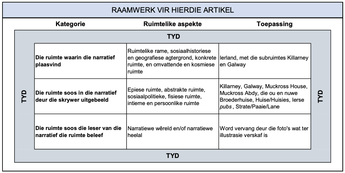 Die voorafgaande bespreking van narratiewe ruimtelikheid en die ruimtelike teorieë van Ryan (2014) en Kort (2004) sal gebruik word om ’n raamwerk vir die ontleding van sekere ruimtelike aspekte in die twee Ierse dagboeke van Schoeman en die boek van Winters te skep. Die raamwerk word ook aangevul deur die ruimtelike elemente soos gebruik deur Lefebvre (1991, in Fuchs 2019), Bachelard (1963), Bakhtin (1982, in Ravysts 2006) en Harvey (1994; 2004), met die doel om ’n volledige beeld van die aanwending van ruimtelike elemente uit die teks te verkry.