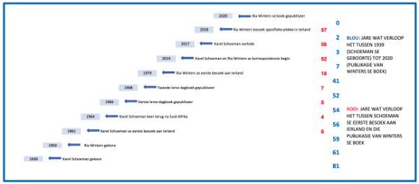Hier onder verskyn ’n samevattende uitleg van die tydsverloop sedert Karel Schoeman in 1939 gebore is, tot en met die publikasie van Ria Winters se boek in 2020.