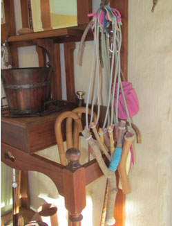 Dis toe ek hierdie klippe so sukkelend moet ronddra en laat val dat ek verstaan hoekom Robin Hood altoos ’n velsakkie in sy belt gedra het: hy’t sy klippe vir sy kéttie daarin gedra, natuurlik. Dit vat my nie lank om vir elke kettie ’n leersakkie met beltknip te maak nie (foto 5 – die kettie is my oudste dogter s’n en ons moes sy been spalk omdat hy wankelrig was).