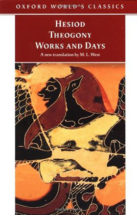ML West, Hesiod, Theogony and Works and Days (1978; in 1999 as ’n Oxford World Classic). West was ’n kenner van Hesiodos, wat in die laaste derde van die 8ste eeu vC gebore is. Hy word reeds in die antieke tyd, en veral deur die naklassieke Alexandrynse geleerdes, in dieselfde asem genoem as die groot Homerus, ons ander groot bron van die Oudgriekse (Mukeense) godsdiens. Hesiodos gee in hierdie werk van hom ’n stelselmatige genealogie van die Oudgriekse gode, asook ’n besonderheidsbeskrywing van die primordiale stryd tussen die oergode van Griekeland. Dit is duidelik, op argeologiese en literêre gronde, dat hy Babiloniese bronne uit die Nabye Ooste tot sy beskikking moes gehad het. Hesiodos het daarin geslag om eie abstrakte beoordeling met argaïese gegewens te kombineer. So dra dit dan ook ’n sterk profetiese inslag. Hesiodos was geboortig uit Beosië, noord van Attika in Griekse Balkan, waar hy ook ’n boerdery bedryf het (van daar dan ook die verdere titel van Dae en werke wat hierdie werk besit). Ploutarchos en ander laat-Griekse skrywers vertel dat hy vermoor is uit wraak omdat hy die suster van sy moordenaars sou verlei het. Sy graf word vandag nog aangewys op Orchomenos in die eertydse Beosië. Soos Homerus het hy in die Ioniese dialek geskryf, maar ook van sy plaaslike Beosiese dialek gebruik gemaak.