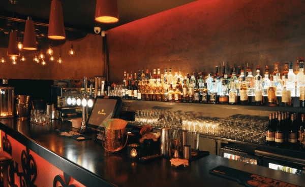 In die spieël glinster die kroeg se naam in neonletters.