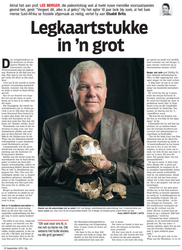 Dinsdagoggend is ek terug na Wits om die beplande diepte-onderhoud met Lee Berger te doen, soos ek vir BY belowe het, en nóg ‘n afspraak na te kom. Ek het so gejaag om terug te kom ek het ‘n spoedboete van R1 000 gekry (vir my eie rekening).