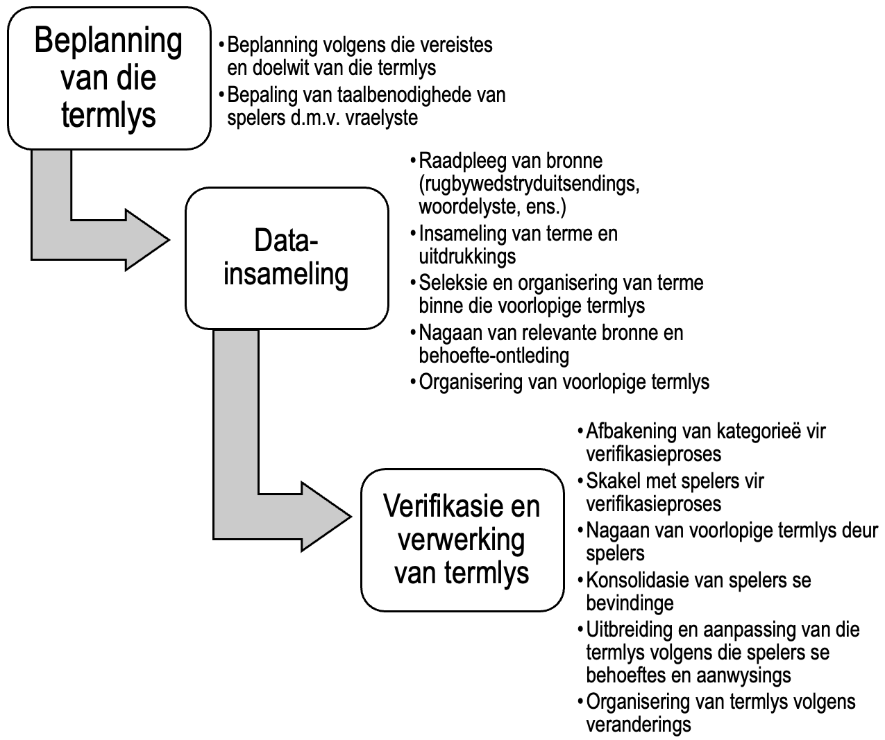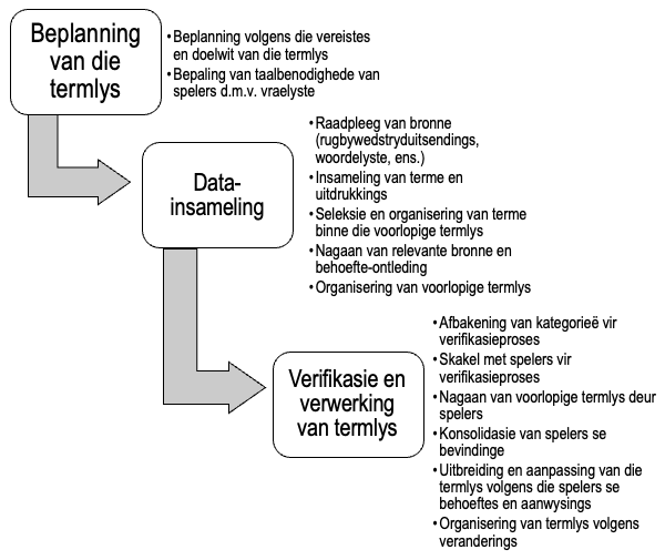 ’n Behoeftebepaling asook deeglike beplanning is gedoen om die taalbehoeftes van die teikengroep (in hierdie geval die rugbyspelers) te identifiseer. Hierdeur is daar vasgestel of ’n termlys vir die teikengroep nuttig sou wees en ook of daar enige leemtes of uitdagings was wat met die skep van so ’n lys benader kan word (kyk afdeling 1.3). Daar is bevind dat die meerderheid spelers ’n behoefte het aan terminologie wat hul begrip en aanleer van basiese opdragte en kommunikasie tussen spanmaats op die veld sal kan vergemaklik. Die positiewe impak wat die bemeestering van noodsaaklike terme, frases en kollokasies binne ’n bepaalde vakgebied kan hê, is in die literatuur bevestig (kyk afd. 2.2) en het as riglyn gedien vir die saamstel van ’n parallelle termlys vir rugbytaal. Die finale lys is die produk van ’n proses van beplanning, data-insameling en verifikasie.