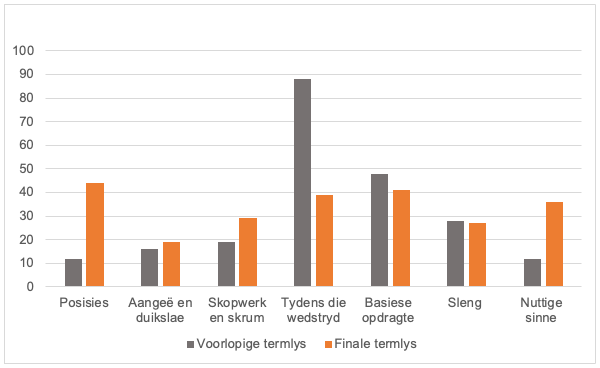 Hierdie veranderinge word uitgelig aan die hand van die getal terme wat deel was van die voorlopige lys, teenoor dié van die finale termlys. In Figuur 2 word ’n vergelyking gemaak tussen die getal terme in die voorlopige en die finale weergawe. Daar was ’n toename van terme in vyf van die sewe kategorieë. Die kategorieë “Tydens die wedstryd” en “Basiese opdragte” het wel ’n afname getoon. Dit is te wyte daaraan dat die inskrywings in hierdie kategorieë óf herrangskik is (dit wil sê oorgeplaas is na ander kategorieë, om die groepering meer sinvol te maak en in ’n meer logiese formaat vir die teikengroep aan te bied) óf dat daar dubbele inskrywings in hierdie kategorie opgemerk is.