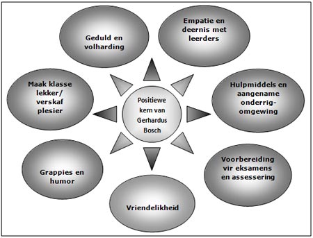 Byna al hierdie hoedanighede van Gerhardus Bosch soos deur die leerders uitgewys (met die uitsondering van “maak klasse lekker”) vorm deel van die dimensies van die Produktiewe Pedagogie-model wat deur Killen (2010:19) saamgestel is: intellektuele kwaliteit, onderlinge verbondenheid, ondersteunende klaskameromgewing en erkenning van individuele verskille.