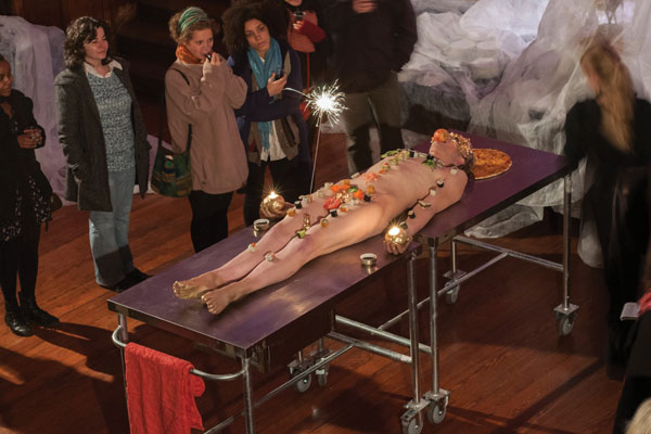 #omnomnom invites audiences to participate in an unusual dining experience – a buffet of treats artfully arranged on the artist’s naked body.