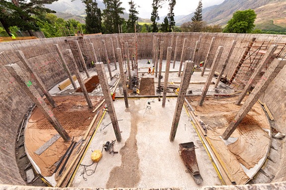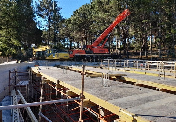 Soos op bogenoemde lugfoto duidelik blyk, is die herstel- en opgraderingsproses van die Rozendal-reservoir voluit aan die gang. Die maatskappy AECOM¹ is gedurende 2019 aangestel om die werk te onderneem. Die oorspronklike dak van gewapende beton van die reservoir is reeds verwyder. Tydens ’n gesprek met die kontrakteur oor die hersirkulering van beton is genoem dat die brokstukke dakbeton in ’n ander projek hergebruik gaan word.