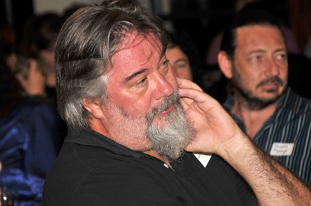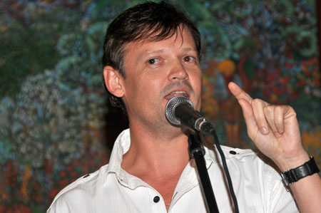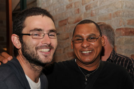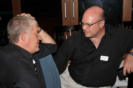 | Gerrit Rautenbach gesels met uitgewer Etienne Bloemhof. Rautenbach se eerste bundel reisverhale, Kopreis, verskyn later vanjaar. | |