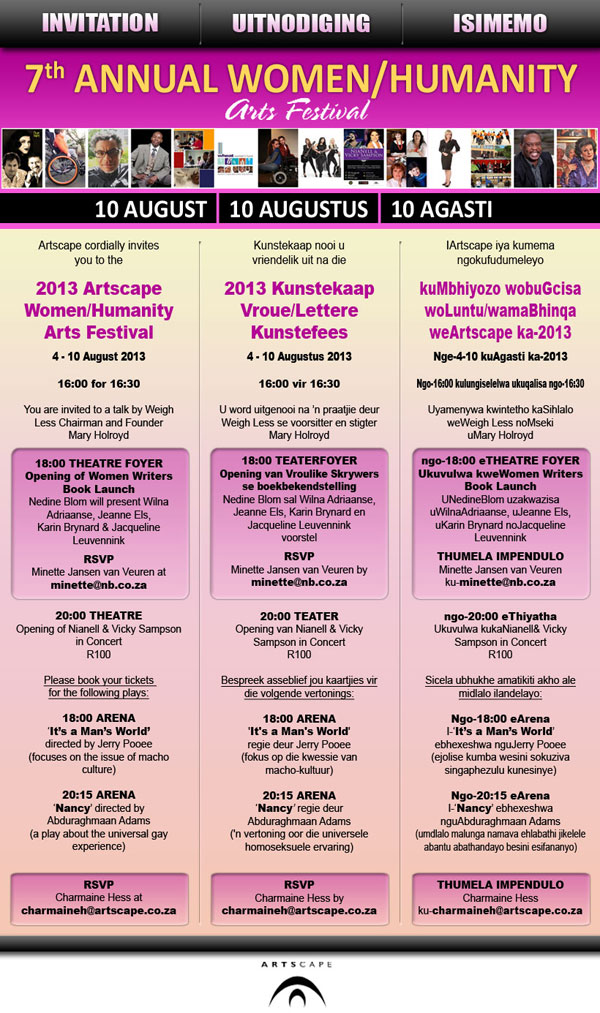 Make sure you don’t miss the opportunity to meet four of NB Publishers’ top women writers! On 10 August, Wilna Adriaanse, Jeanne Els, Karin Brynard and Jacqueline Leuvennink will talk about their writing at the 2013 Artscape Woman/Humanity Arts Festival. Be part of this special event and bring your friends along for a glass of wine and a chat with the authors.